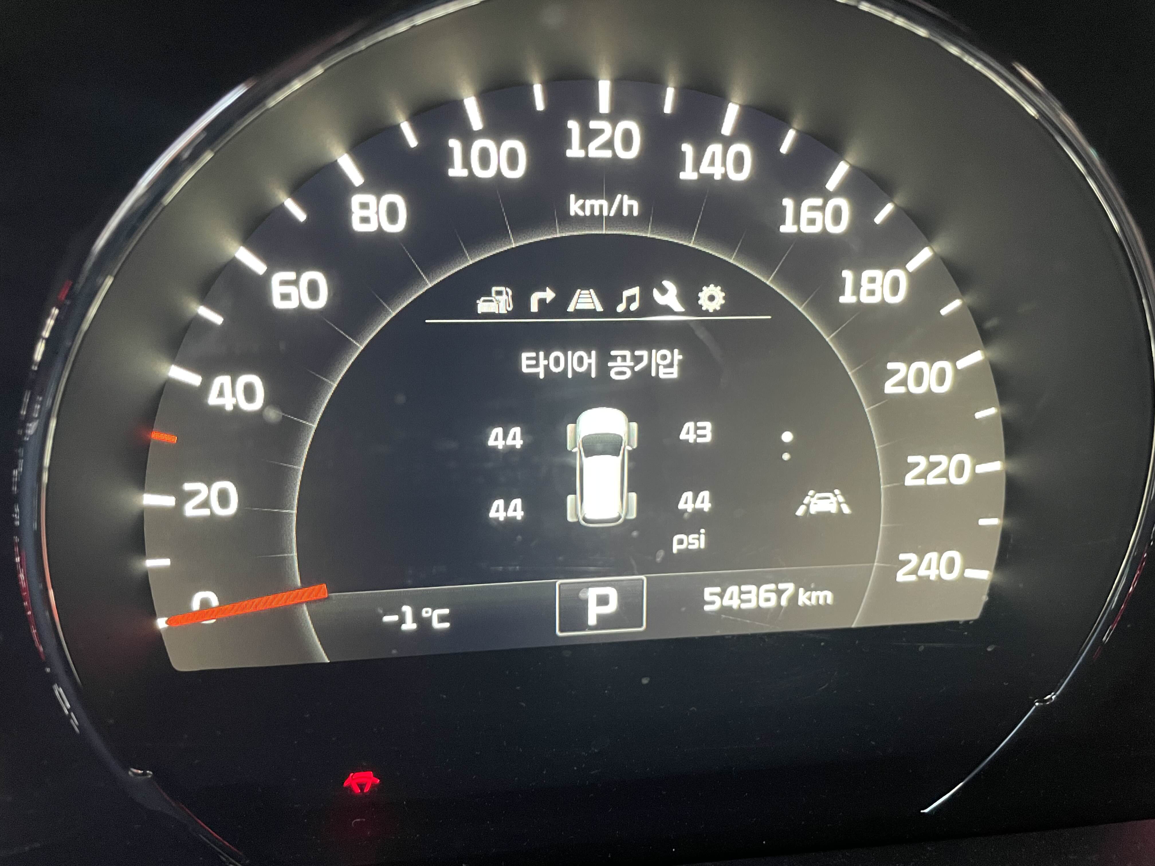 모든 바퀴에 공기를 넣고 공기압을 확인해보니 모든 바퀴가 43~44로 맞춰졌다. 타이어에 공기를 넣자마자 타이어 공기압 경고등이 사라지지 않는다. 5분 정도 운전을 하면 타이어 공기압이 정상이라고 판단되면 그때 타이어 공기압 경고등이 사라진다.