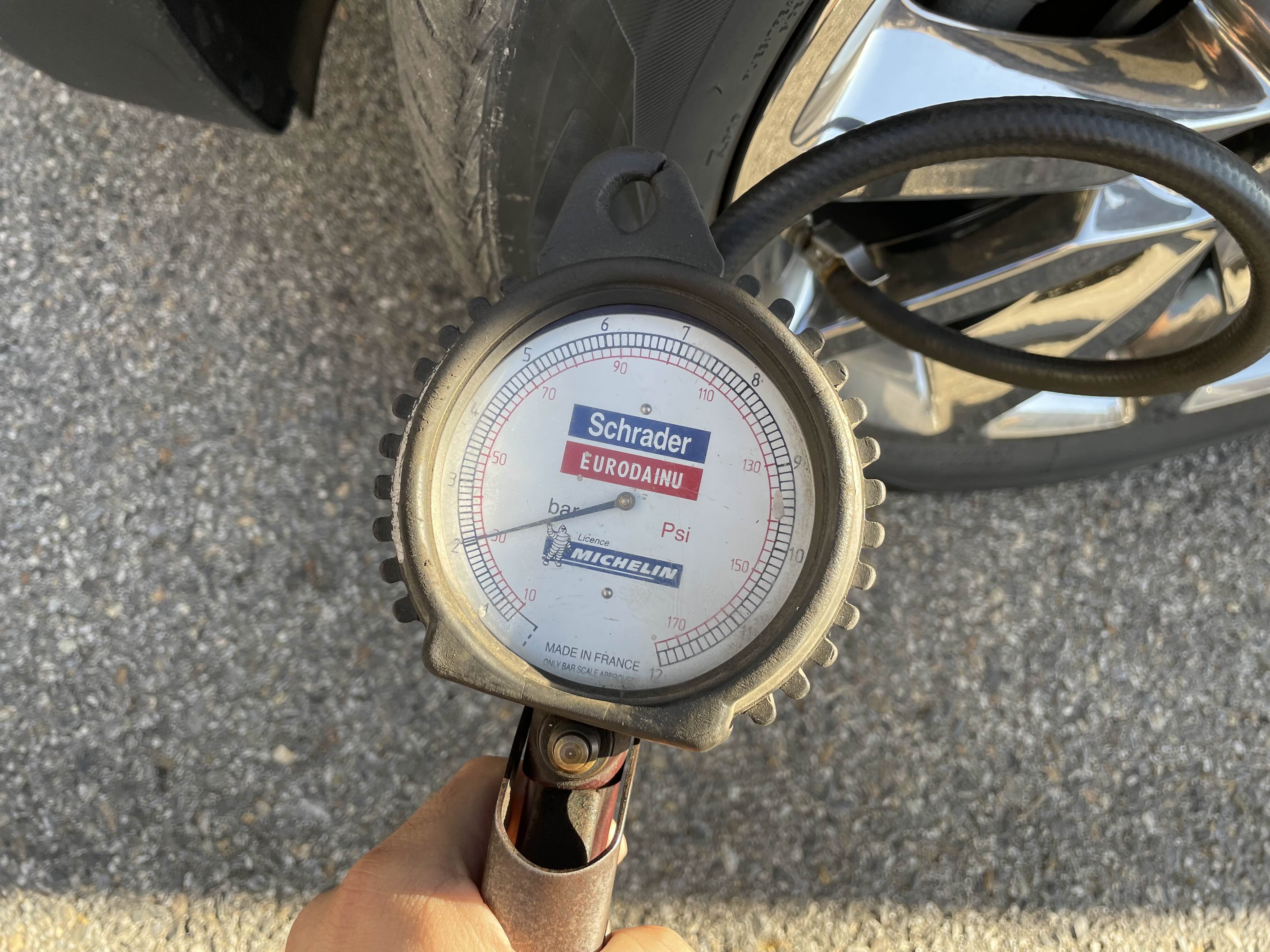 모든 바퀴에 공기를 넣고 공기압을 확인해보니 모든 바퀴가 43~44로 맞춰졌다. 타이어에 공기를 넣자마자 타이어 공기압 경고등이 사라지지 않는다. 5분 정도 운전을 하면 타이어 공기압이 정상이라고 판단되면 그때 타이어 공기압 경고등이 사라진다.