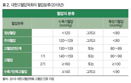 수축기 혈압 120~139㎜Hg, 이완기 혈압 80~89㎜Hg까지 올라가면 고혈압 전 단계 그 이상은 고혈압으로 진단한다.