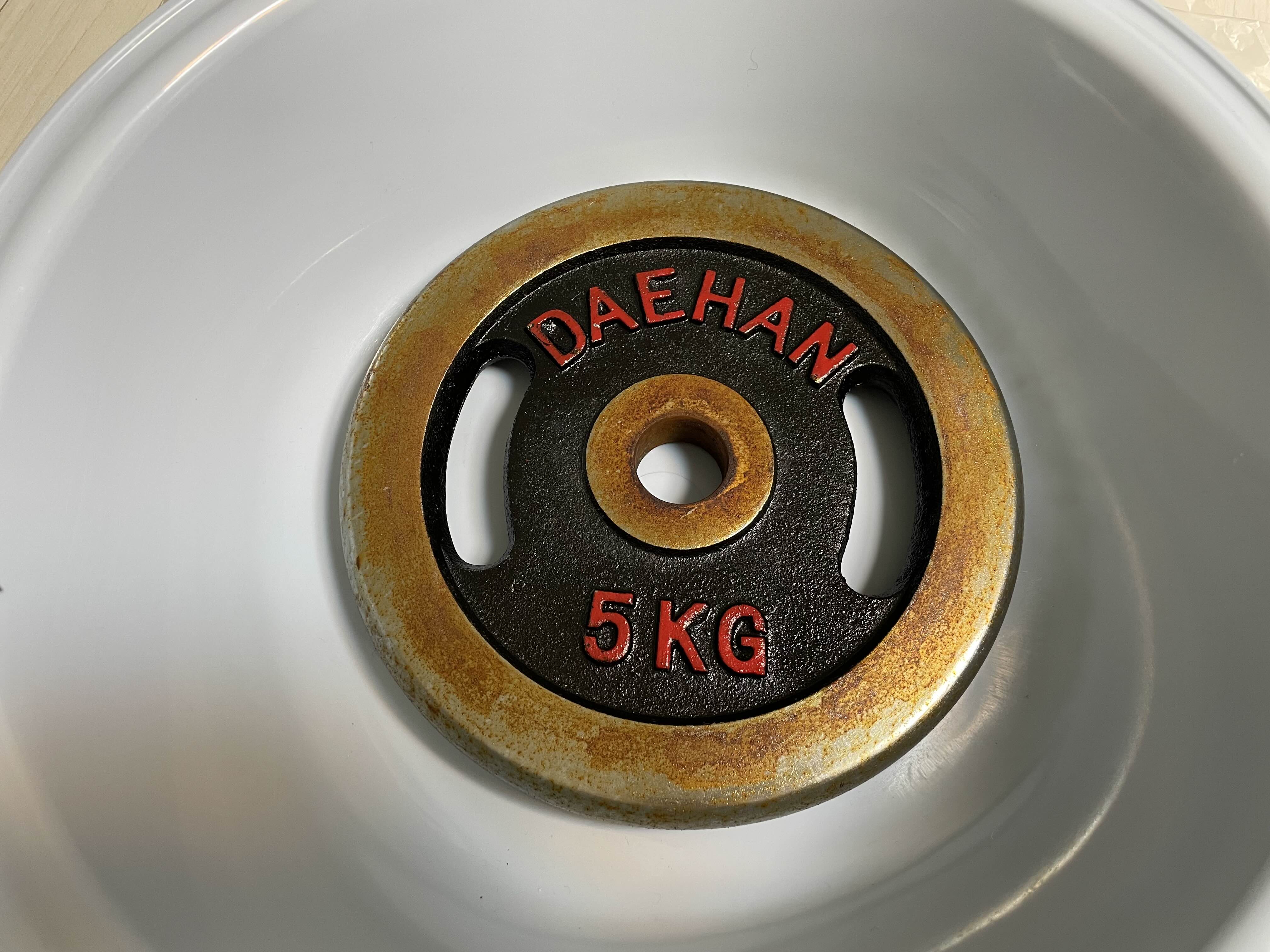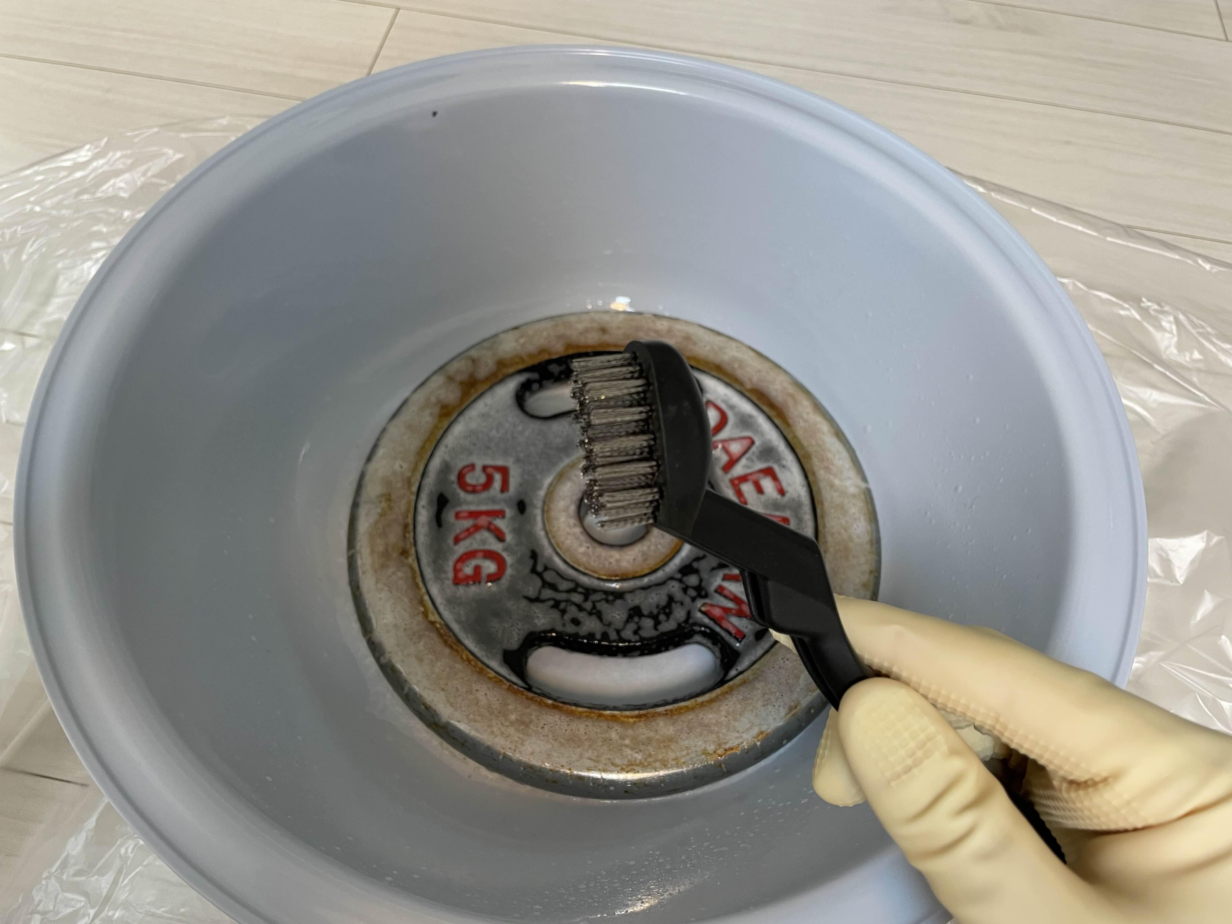 이제 본격적으로 녹 제거를 시작해 보자. 바닥에 비닐을 깔고 그 위에 세숫대야를 놓는다. 그리고 세숫대야에 오늘의 주인공 중량 원판을 놓는다.