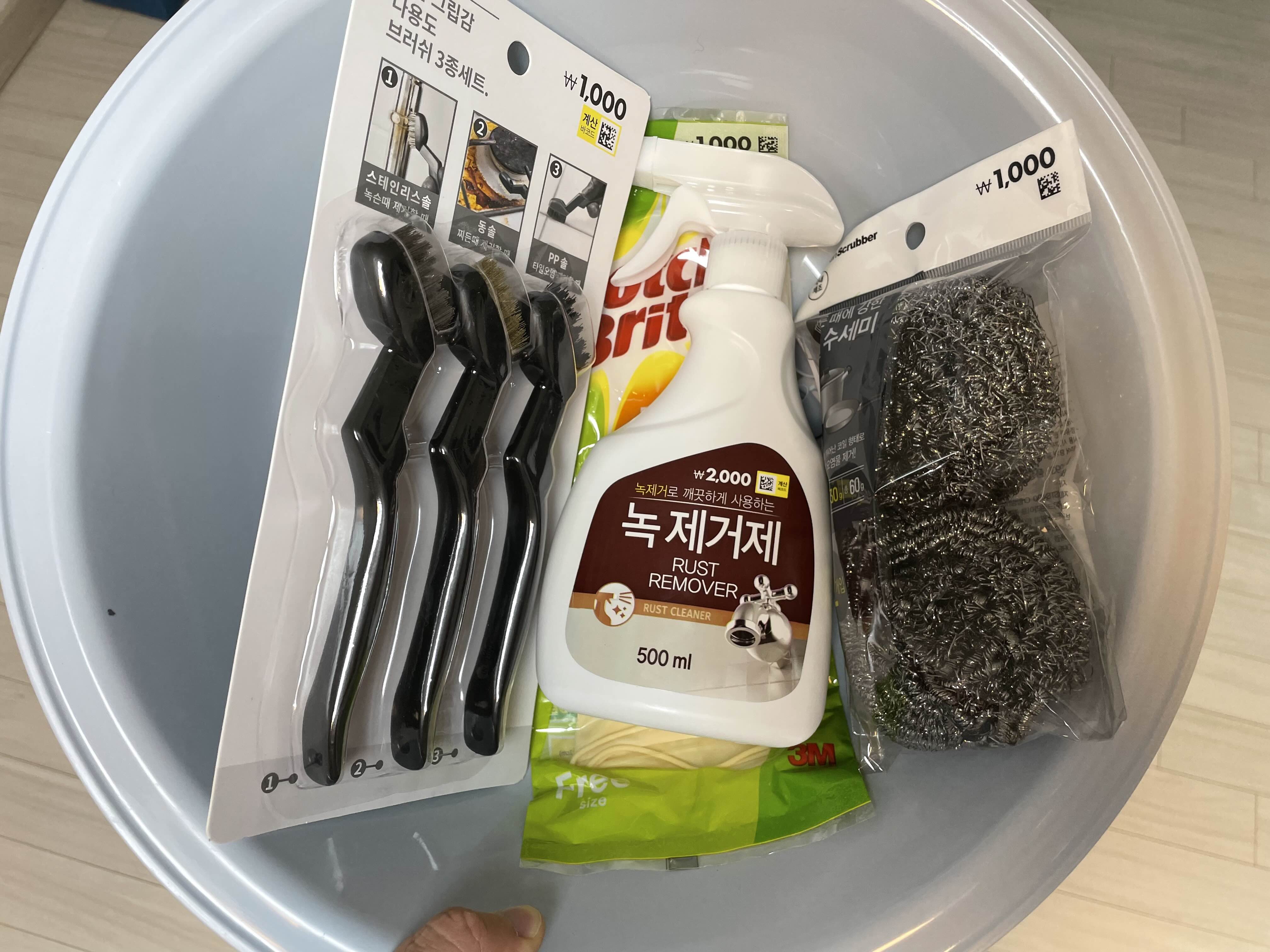 녹 제거제(500ml), 다용도 브러쉬 3종세트 이 두 개는 반드시 필요한 준비물이다. 필자는 만약을 대비해 철수세미를 추가로 더 샀는데 브러시만으로도 충분히 녹을 제거할 수 있었다. 작업의 편의성을 위해 고무장갑과 대야도 샀다.