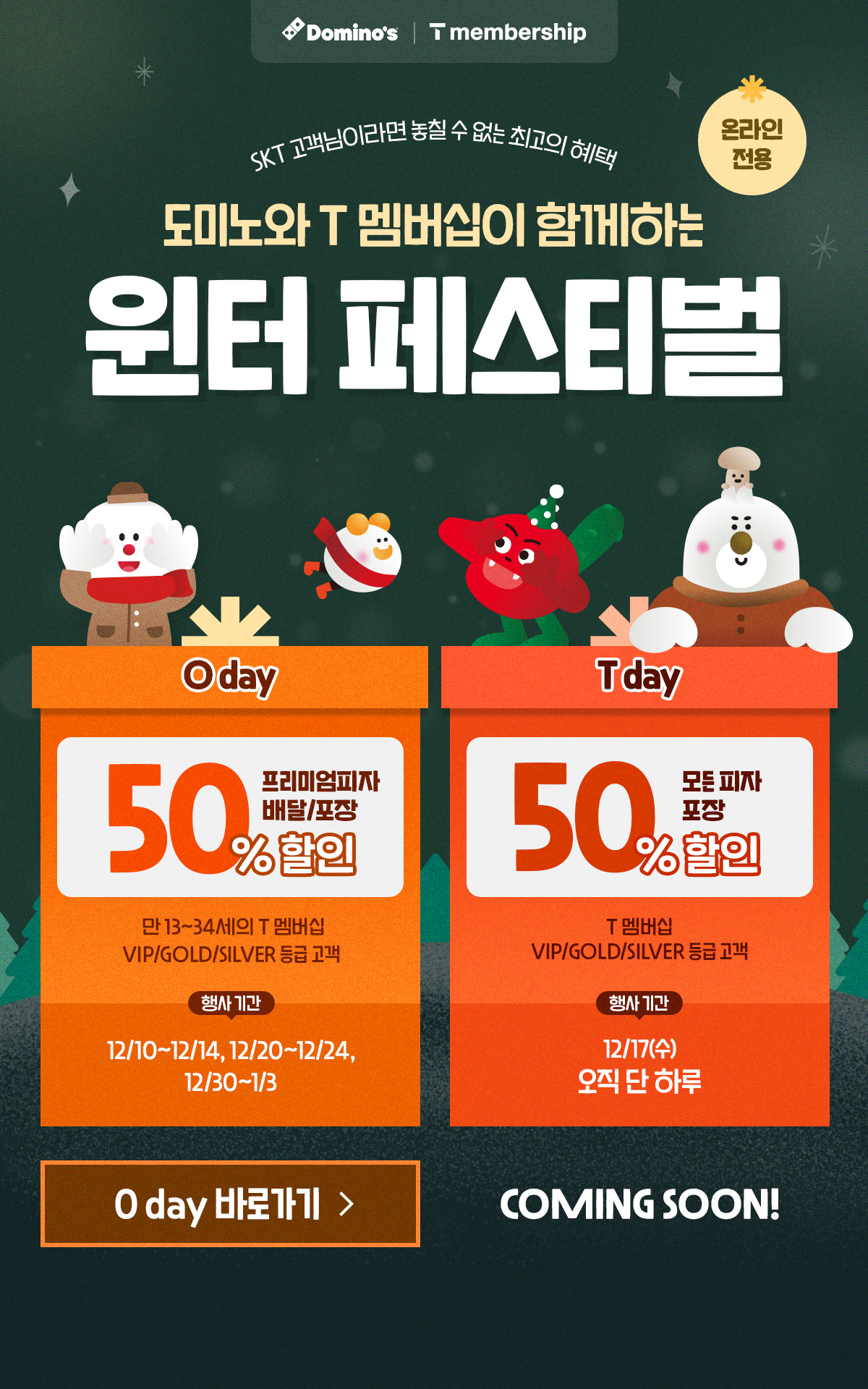 A1. 이번 도미노피자 SKT 윈터 페스티벌은 T멤버십 VIP·GOLD·SILVER 등급 고객을 대상으로 하며, 이 세 등급에 해당해야 0 day와 T day 혜택을 모두 이용할 수 있습니다.