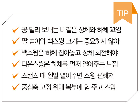 백스윙에서는 하체를 잡아놓은 상태에서 상체를 돌리고 다운스윙 때는 하체를 먼저 열어준다는 느낌으로 쳐야 한다.