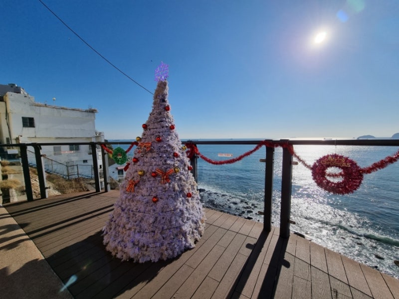 영도구에 위치한 흰여울문화마을은 '한국의 산토리니'라는 별명으로 불리며 연중 내내 인기 있는 관광지입니다. 특히 크리스마스 시즌에는 마을 곳곳에 장식이 더해져 더욱 아름다운 풍경을 선사합니다. 새하얀 벽면 사이로 새파란 부산 바다가 보이는 이송도 전망대는 흰여울마을의 가장 유명한 포토존입니다.