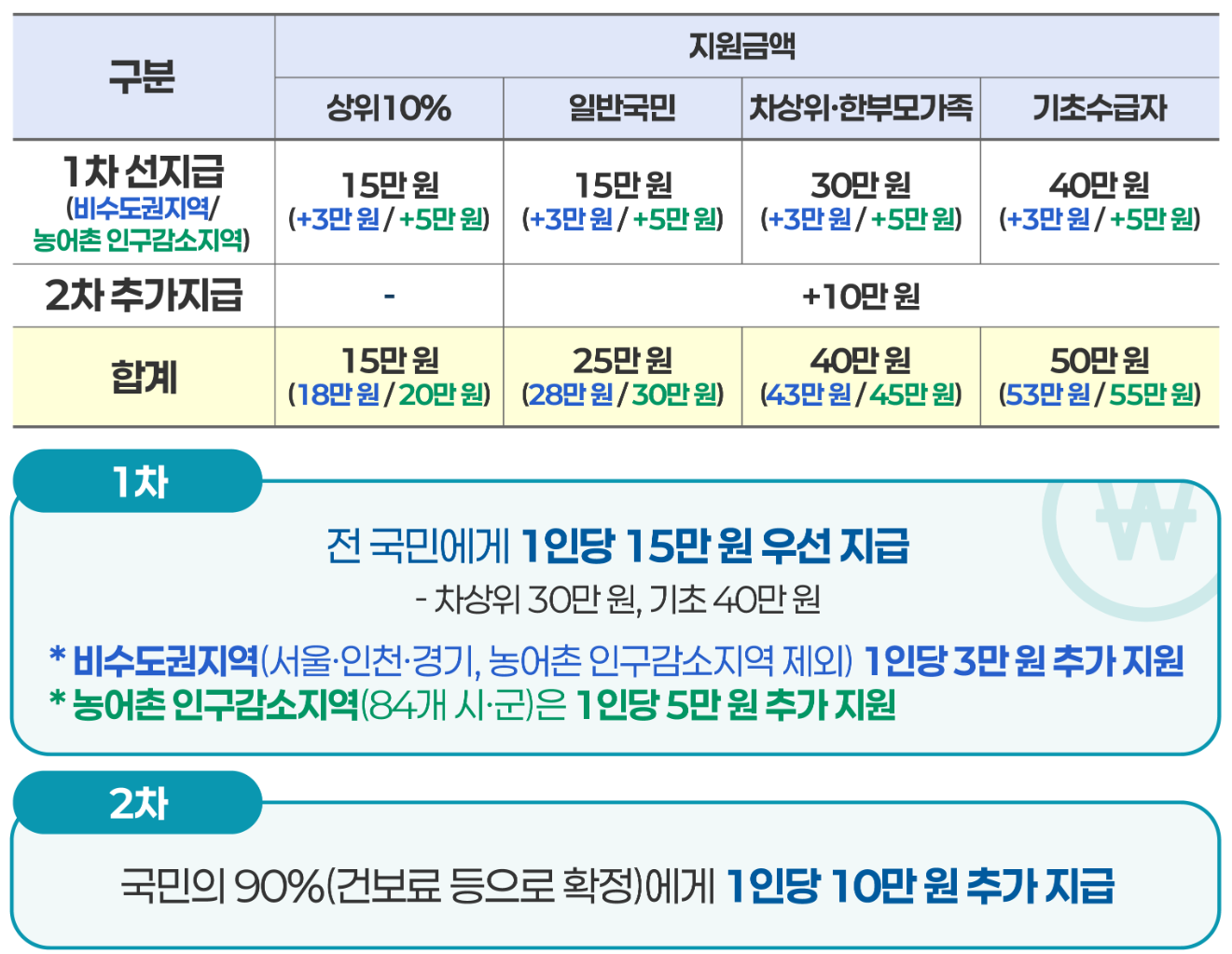 - 2차 지급(국민 90%)은 1인당 10만 원 추가