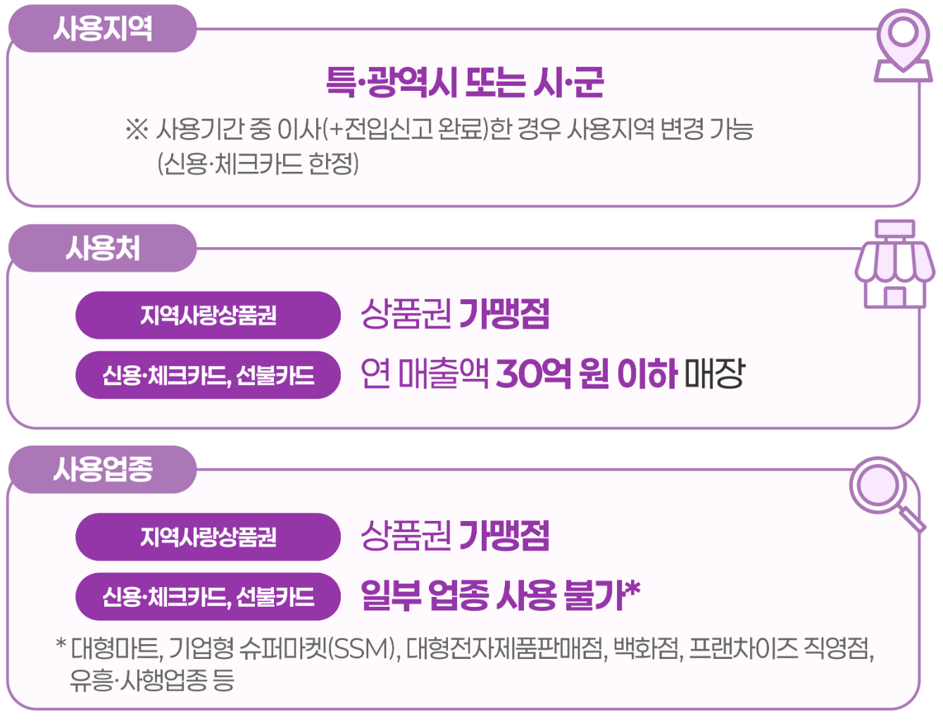 연 매출 30억 이하 소상공인 매장(전통시장, 동네마트, 식당 등)에서만 사용 가능합니다. 대형마트, 백화점, 외구계 직영 매장 등에서는 사용이 불가능합니다.