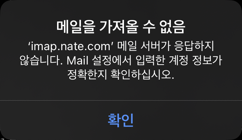 가끔 계정 추가시 오류가 발생하는 경우가 있다. 이럴 경우에는 설정 → 메일 → 계정으로 들어가서 정확한 비밀번호, IMAP 주소를 입력해주면 해결된다.