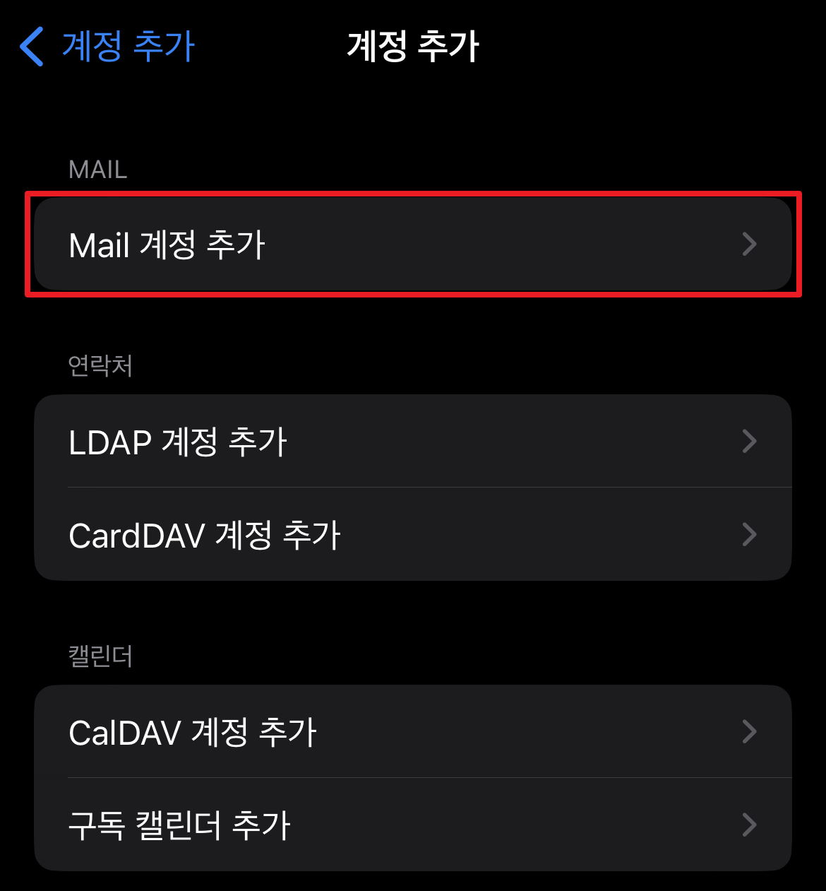 STEP 1. 아이폰 설정에서 메일 계정 추가 메뉴로 들어간다.