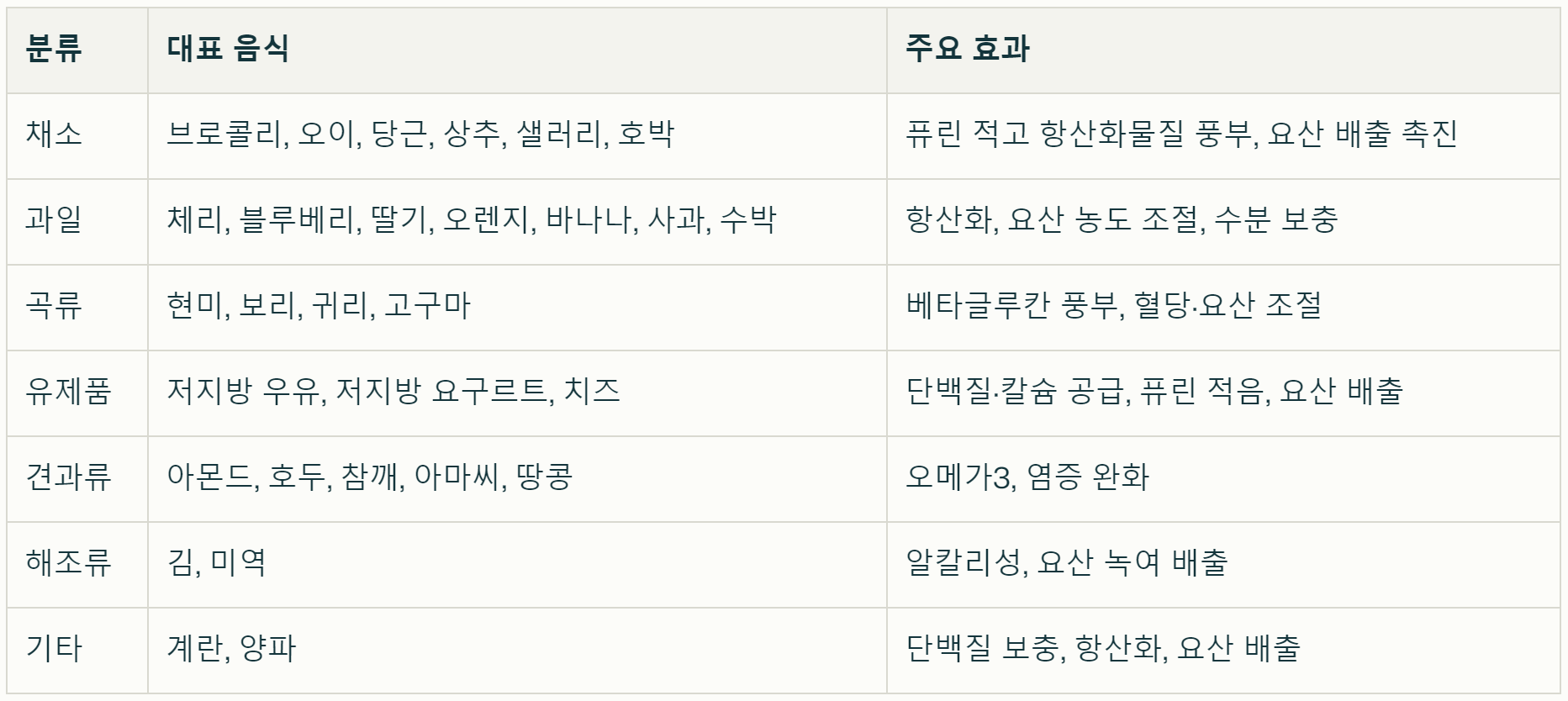 - 식단 바꾸기: 퓨린 적은 음식 위주로 식단 구성