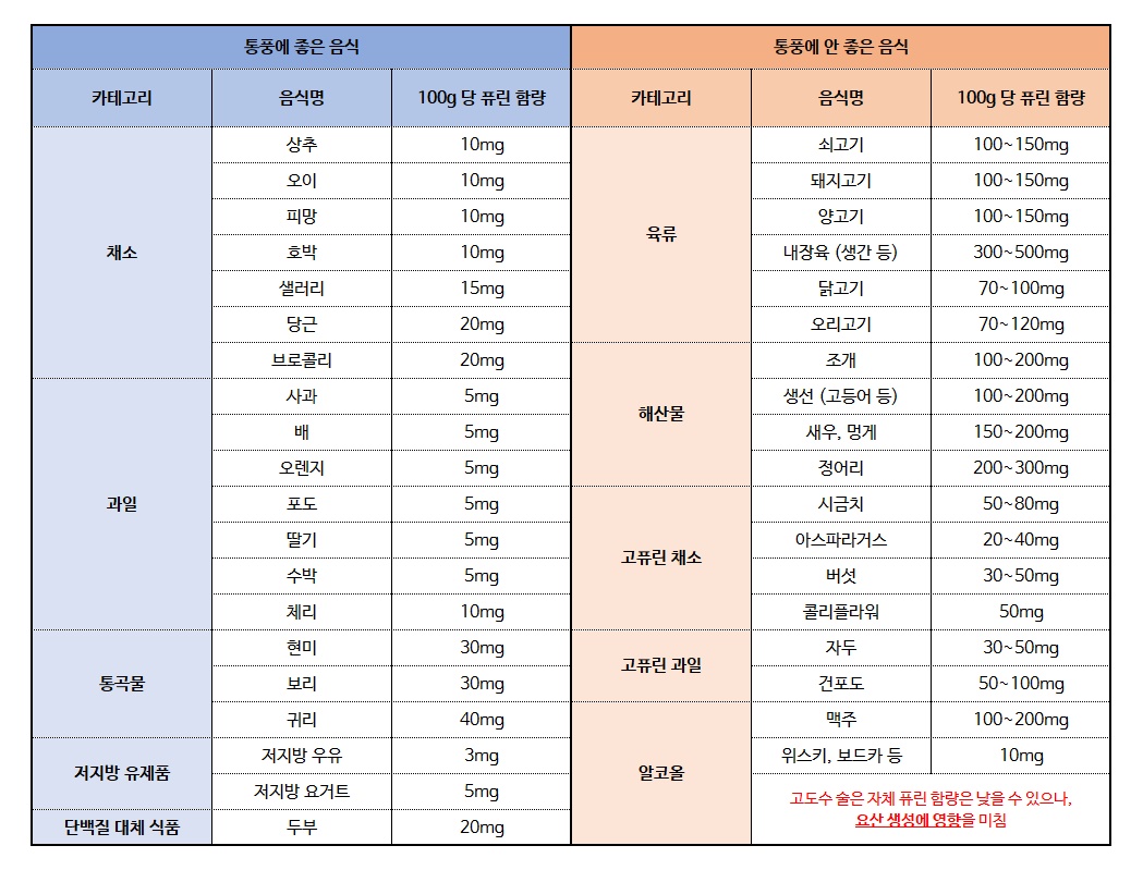 - 급성 통풍 발작 시 고단백·고퓨린 음식 즉시 중단