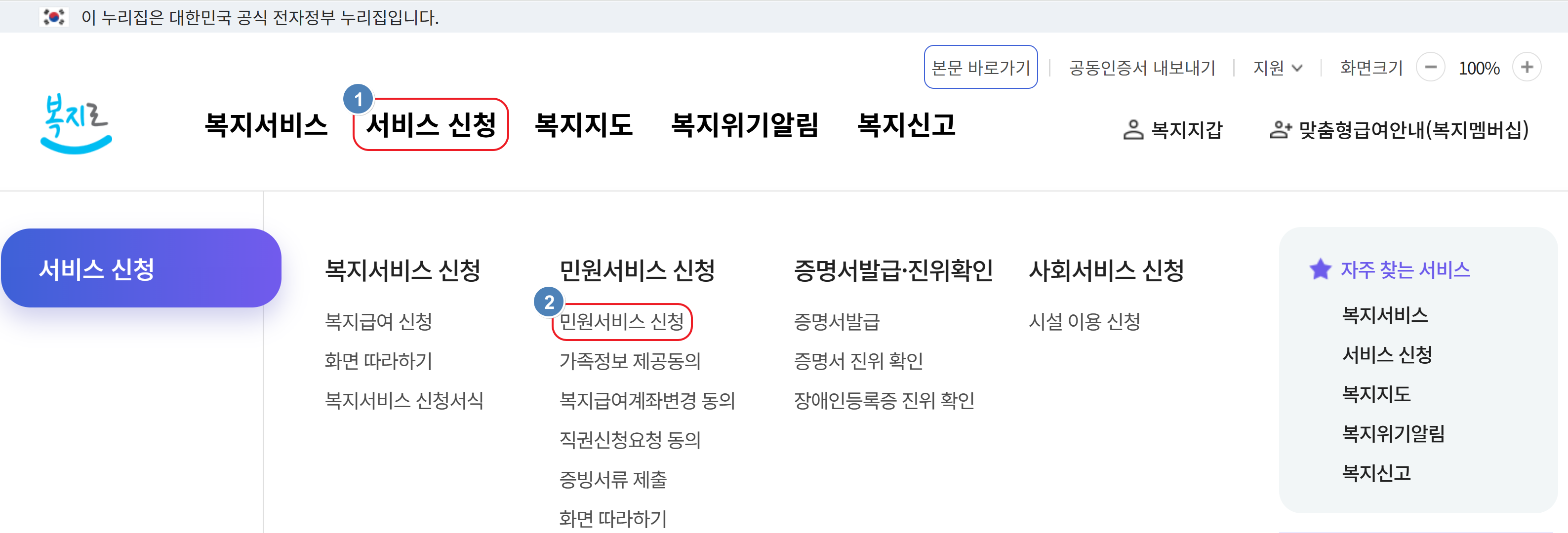 1. 복지로 사이트에서 서비스 신청 → 민원서비스 신청 메뉴로 들어갑니다.