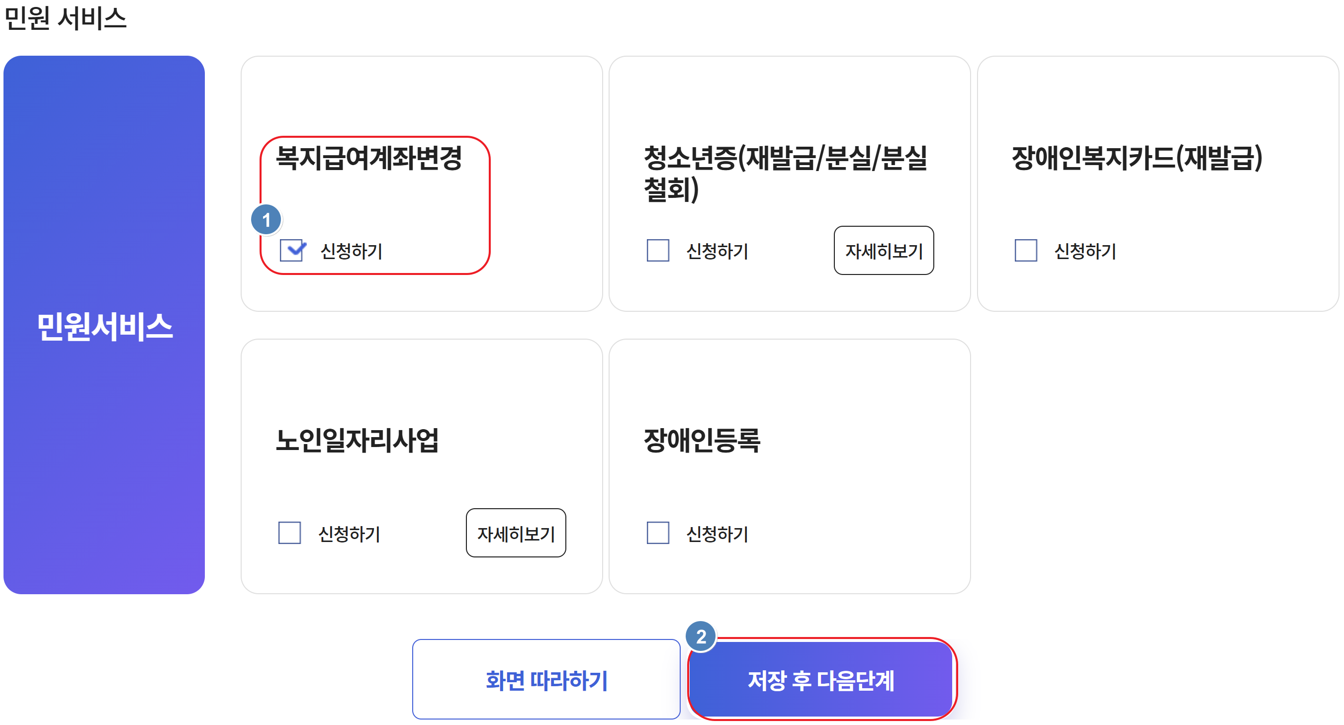 2. 복지급여계좌변경 신청하기를 체크한 다음 저장 후 다음단계를 선택합니다.