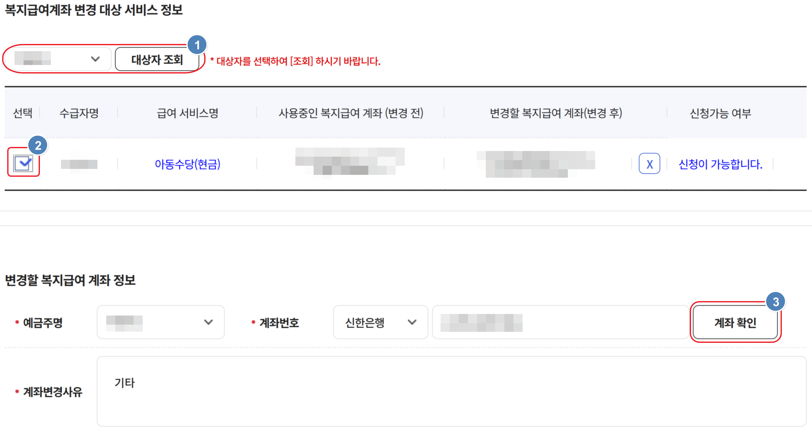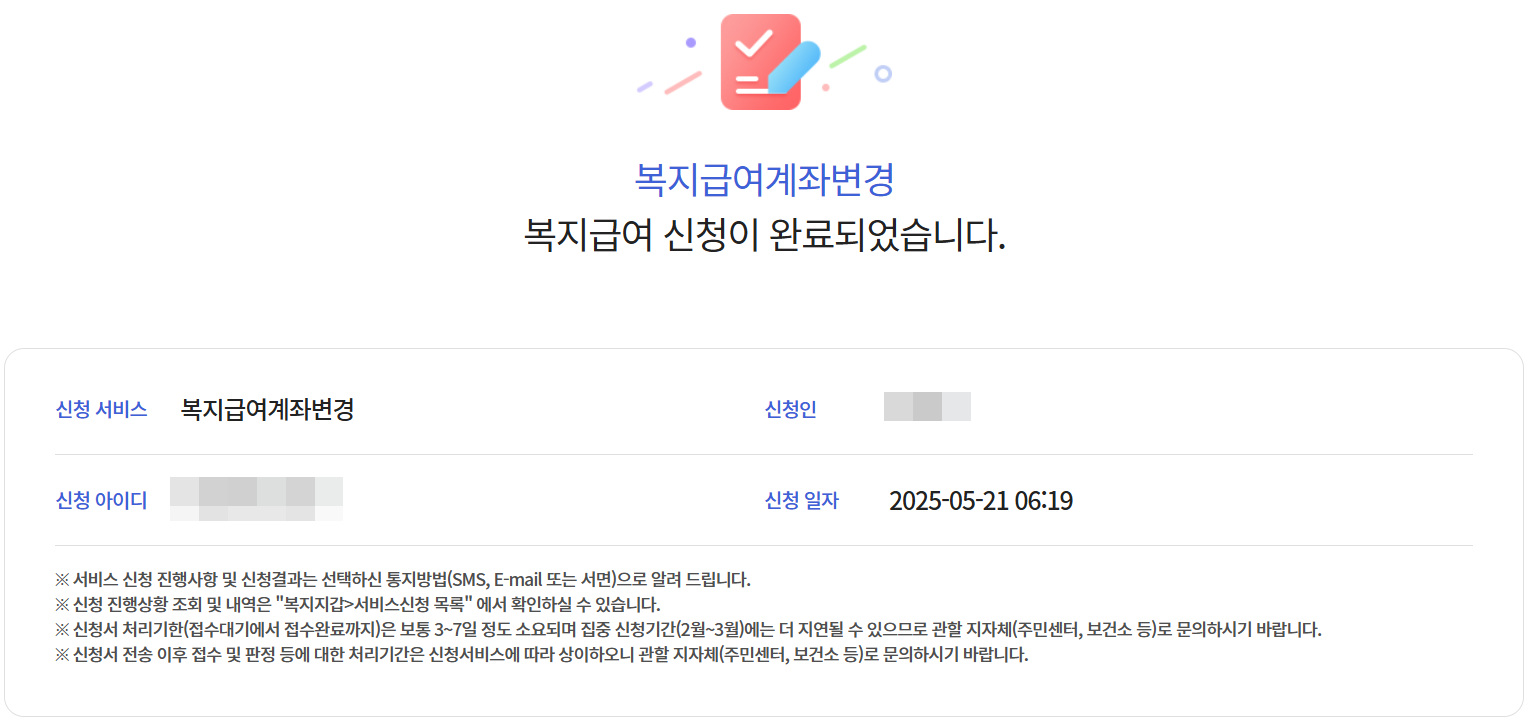 - 필요서류 준비 : 복지급여계좌변경신청서, 신분증, 변경할 명의의 통장 사본