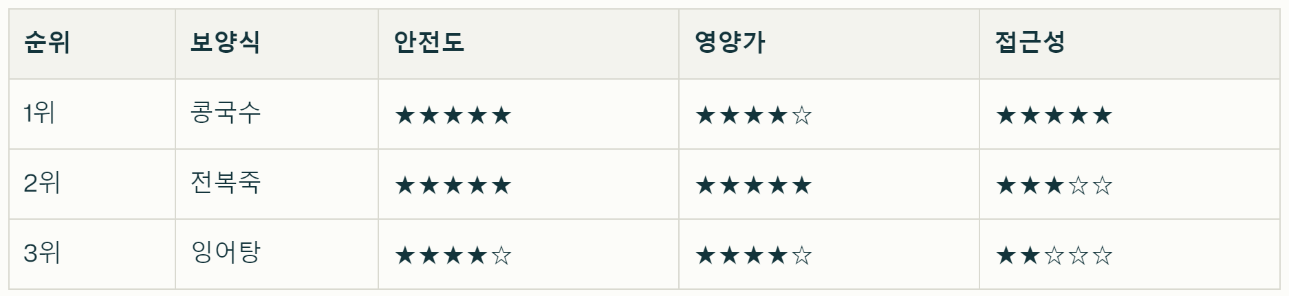 - 몸의 반응을 관찰하며 점진적으로 다른 보양식을 시도하세요