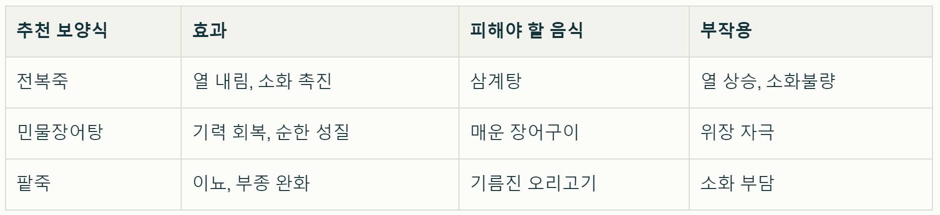 - 몸의 반응을 관찰하며 점진적으로 다른 보양식을 시도하세요