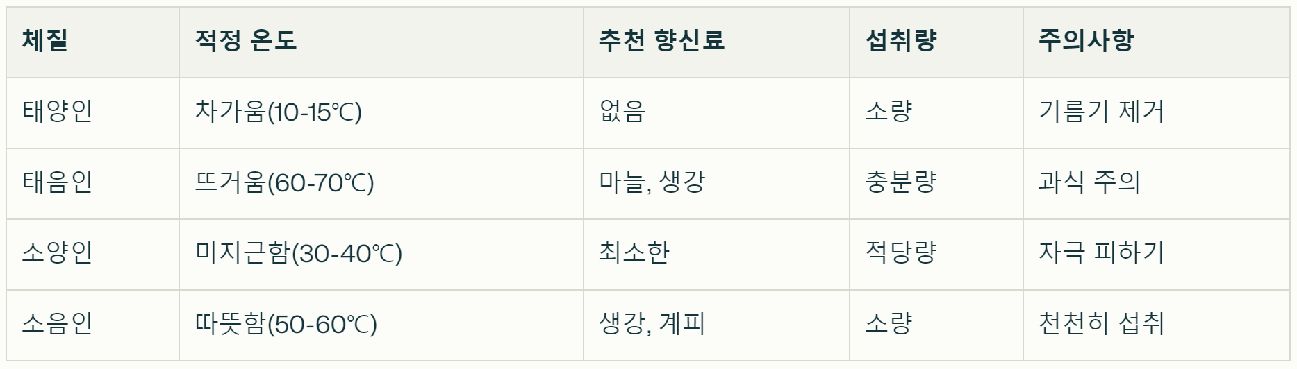 태음인과 소음인은 따뜻한 온도로 섭취해야 합니다. 특히 소음인은 생강, 계피, 후추 등 따뜻한 향신료를 추가하여 소화를 돕고 몸을 따뜻하게 하는 것이 좋습니다.