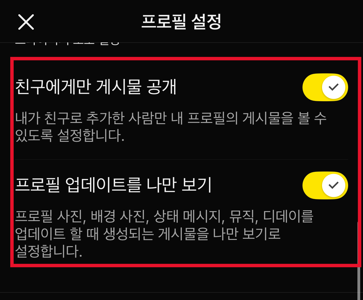 프로필 업데이트 알림 끄기, 친구에게만 게시물 공개 등 개인정보 노출을 줄이는 설정이 도움이 됩니다.
