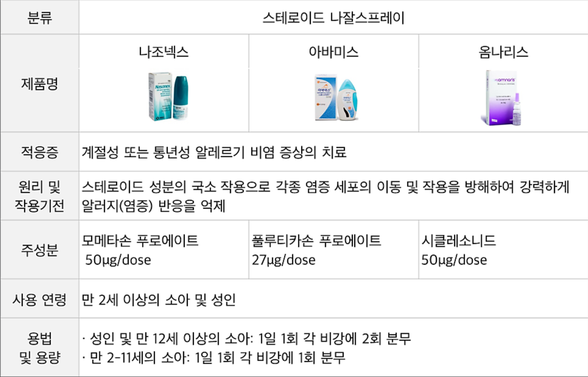 • 플루티카손: 아바미스(플루티카손 푸로에이트) 등으로 처방되며 사용감 선호도가 높습니다.