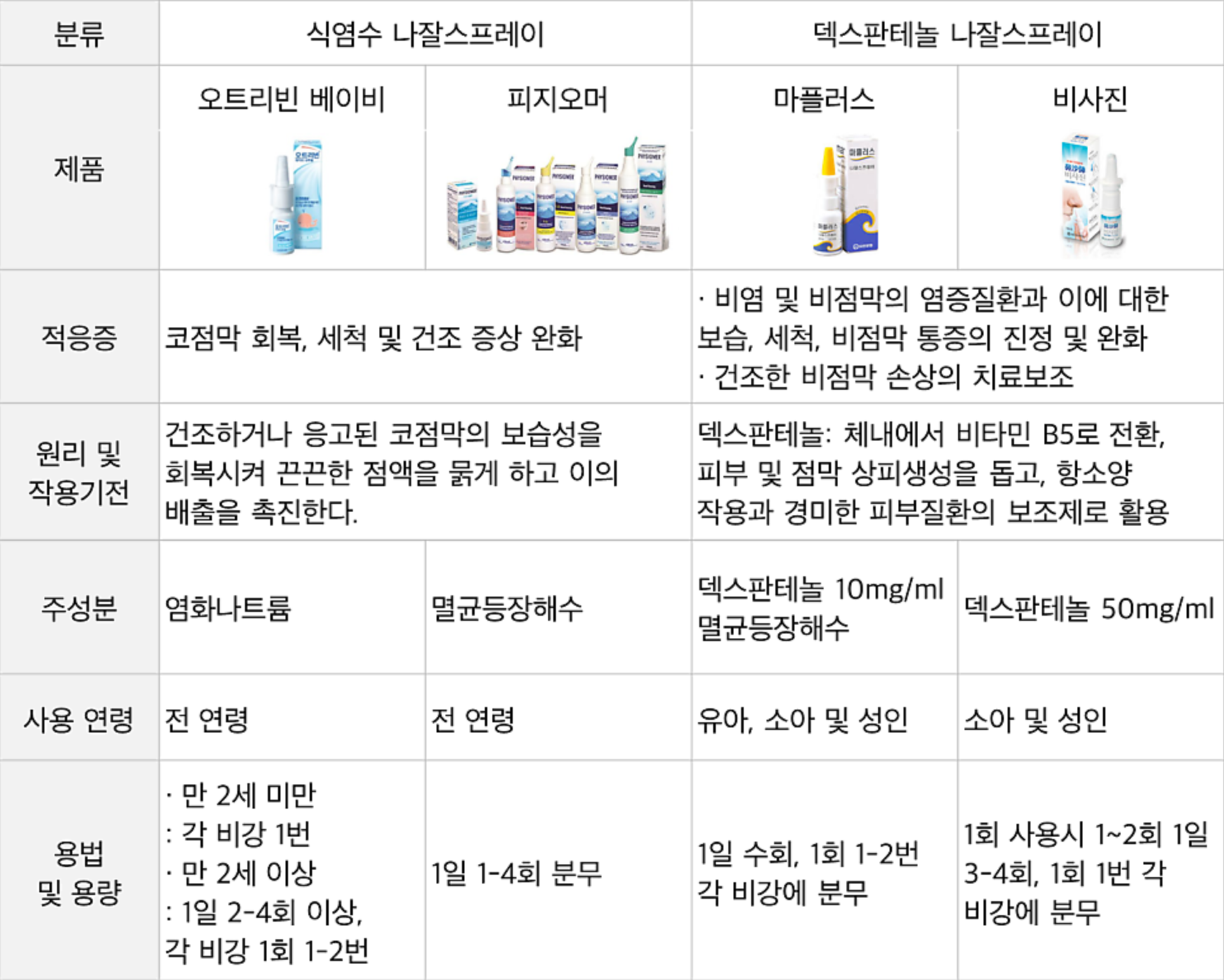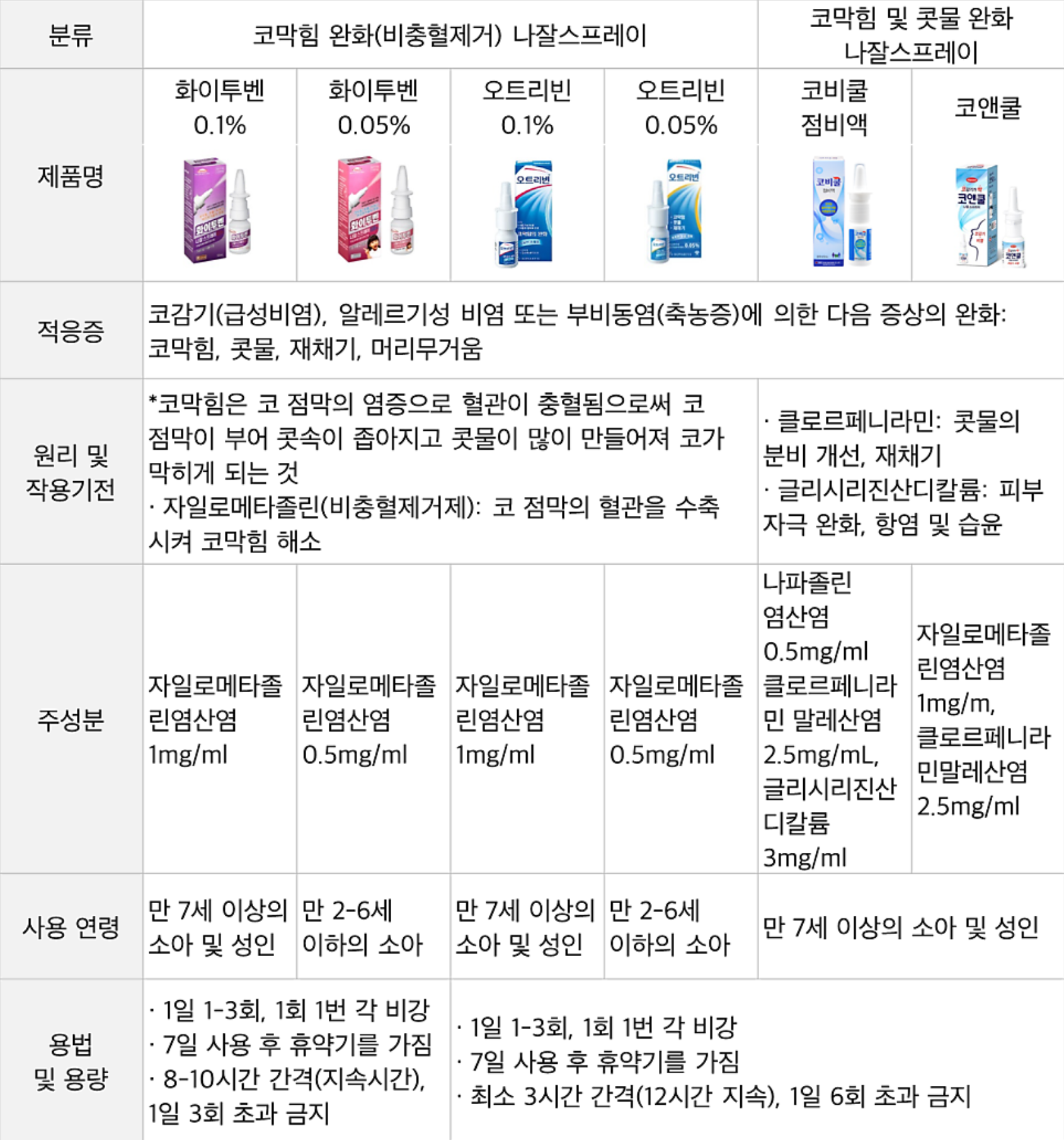 • 기타: 국내 일반약 카테고리에는 페닐레프린, 옥시메타졸린 기반 스프레이도 존재합니다.