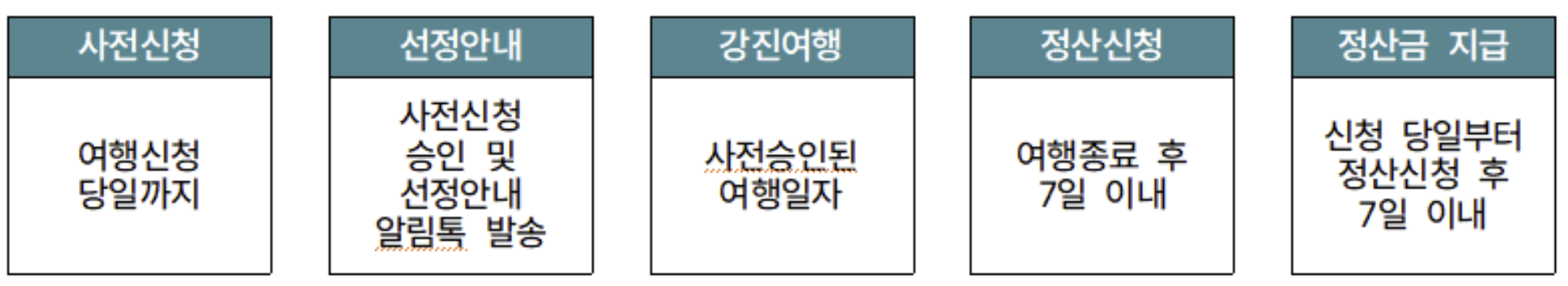 여행 후 정산 신청은 여행 종료 후 7일 이내에 영수증과 관광지 방문 인증사진 등 증빙서류를 제출해야 합니다.