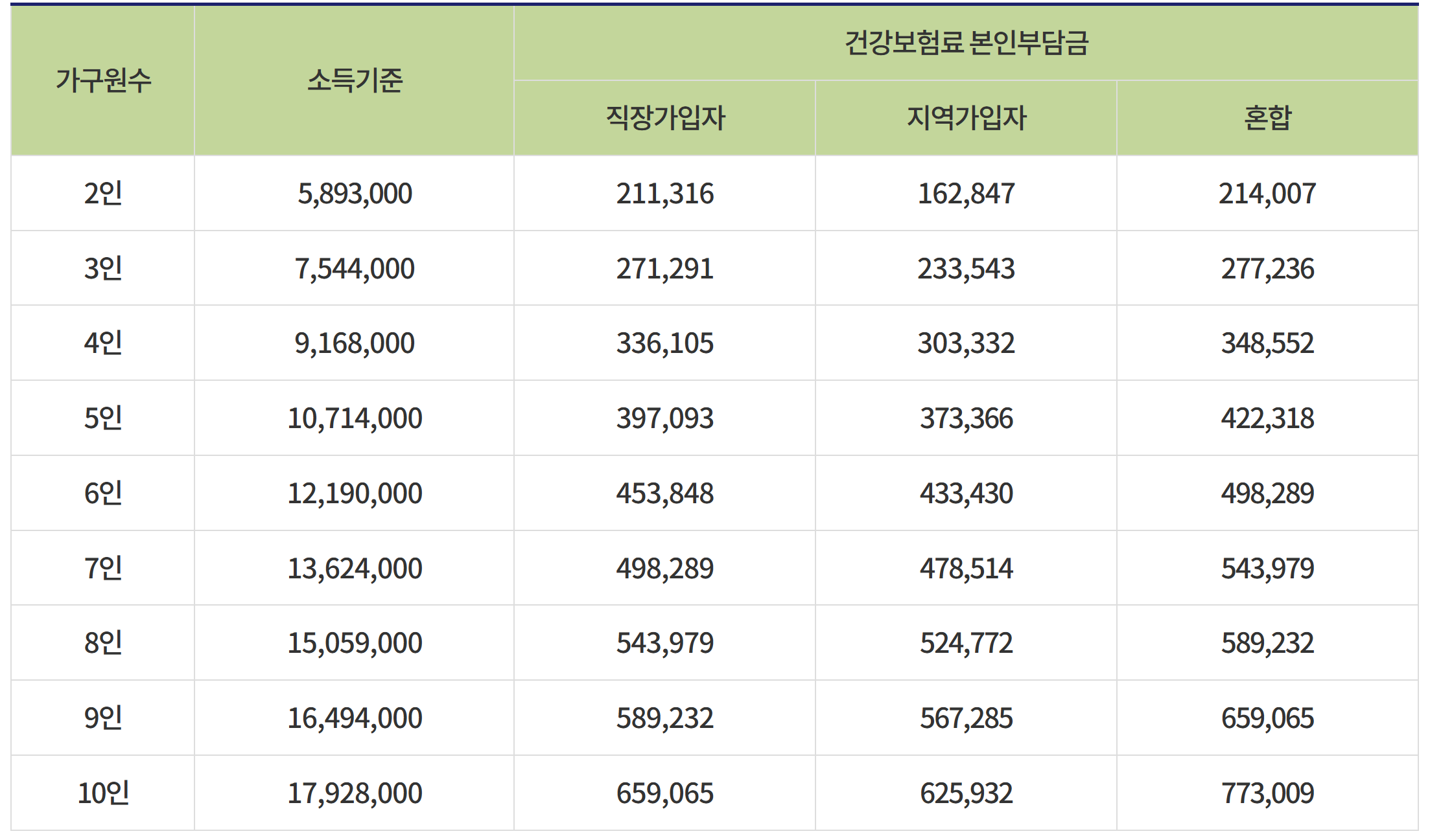2024년 기준중위소득 160% 건강보험료 소득판정기준표