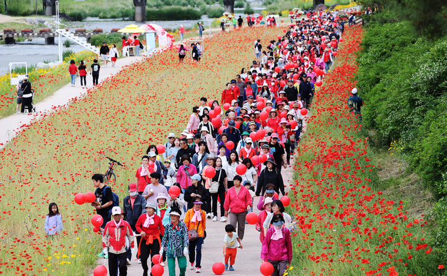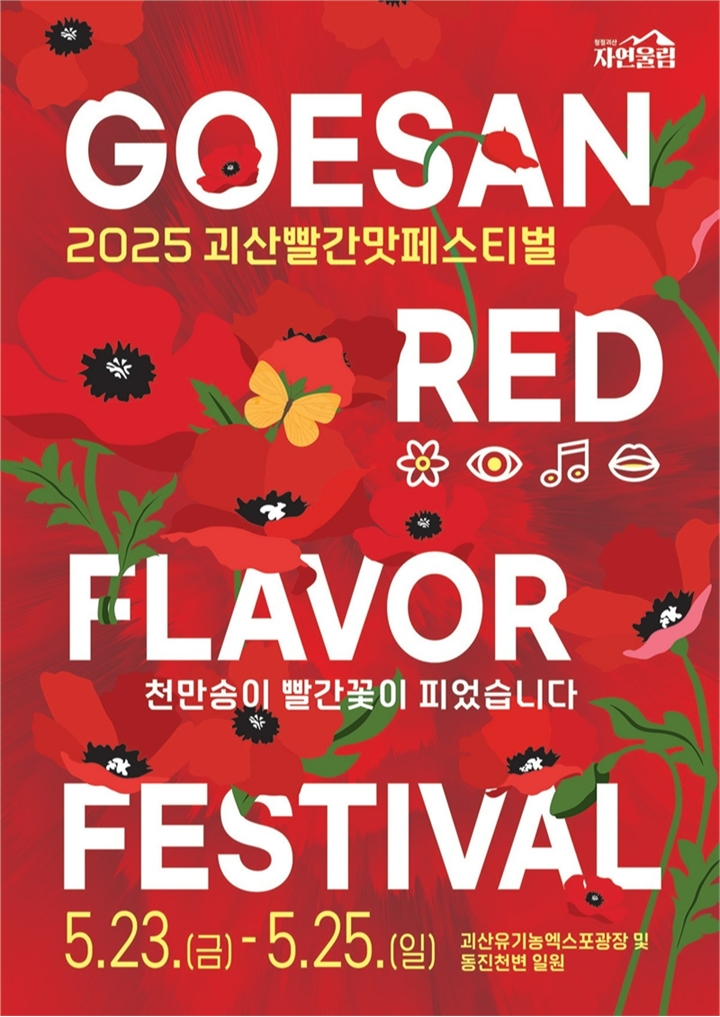 괴산 빨간맛 페스티벌은 괴산 유기농엑스포광장과 동진천변 일대에서 열립니다. 괴산의 대표 농산물인 고추와 양귀비·백일홍·장미 등 붉은 봄꽃에서 착안한 빨간색을 테마로 한 이색 봄 축제입니다. '천만 송이 빨간 꽃이 피었습니다'를 주제로 동진천변에 조성된 대규모 빨간 봄꽃밭과 음악분수, 나비터널, 감성 포토존 등 화려한 볼거리가 펼쳐집니다.