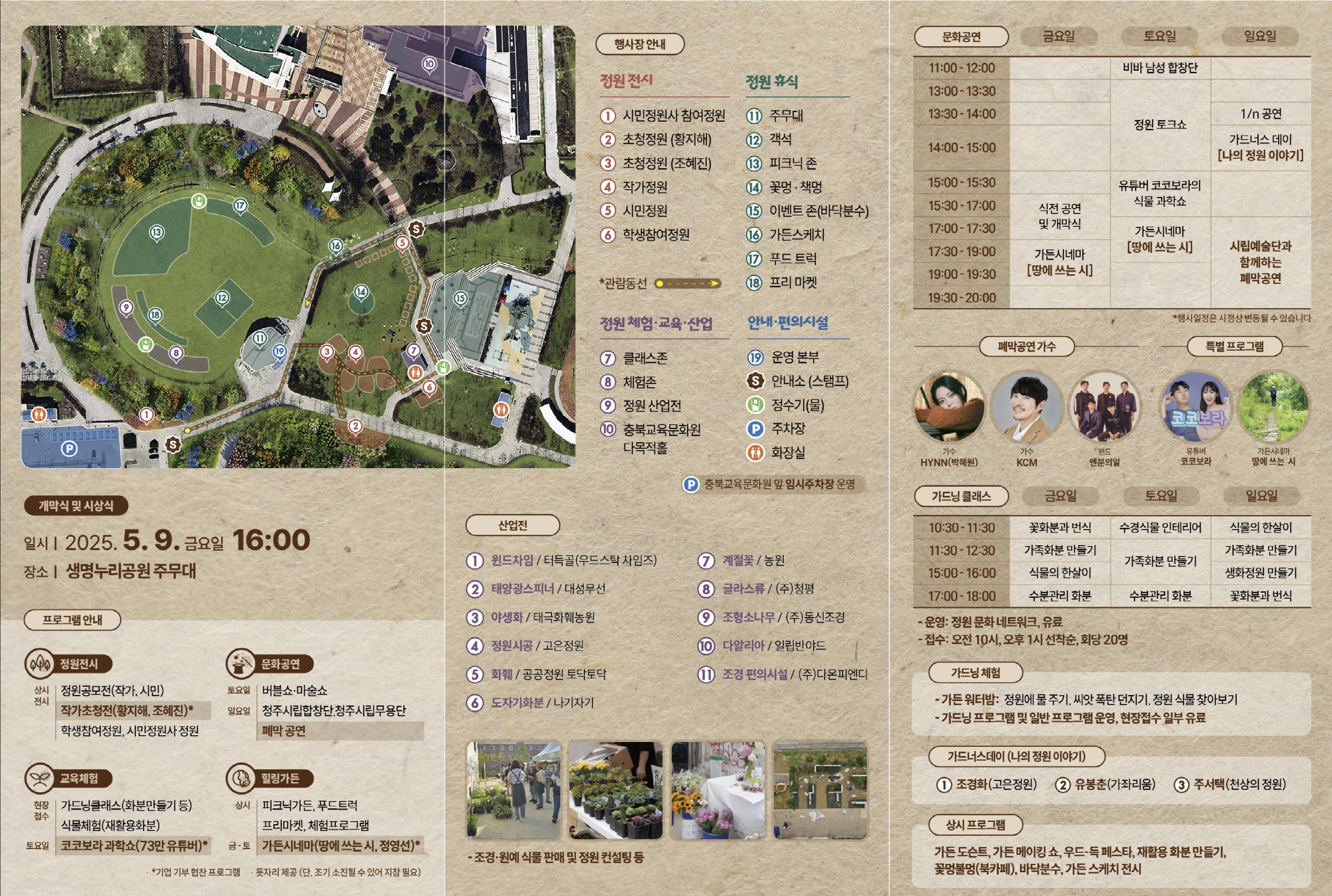 피크닉 가든, 프리마켓, 푸드트럭, 버블쇼, 마술쇼, 청주시립합창단·무용단 공연 등 가족 단위와 정원 애호가 모두를 위한 볼거리와 즐길 거리가 풍성하며, 자연과 예술, 힐링을 동시에 경험할 수 있는 것이 특징입니다. 입장료는 무료이나 일부 체험은 유료로 운영됩니다.