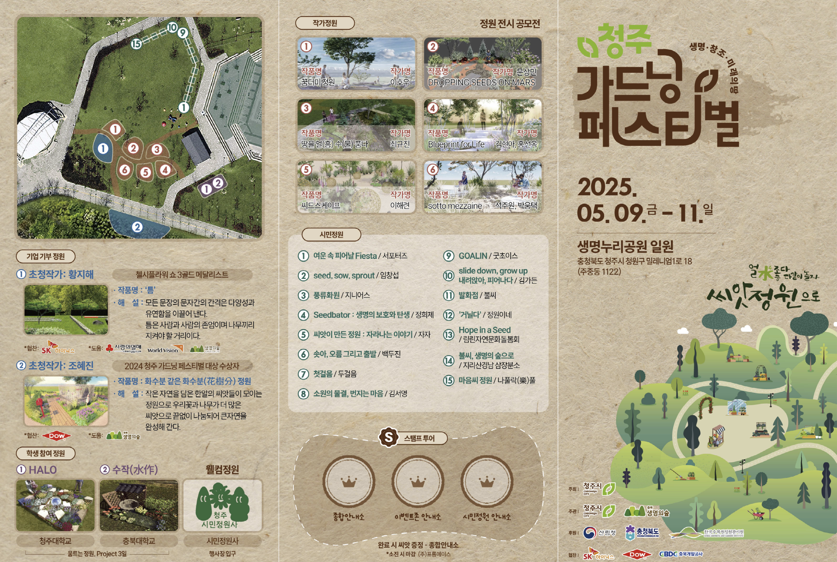 청주 가드닝 페스티벌은 생명누리공원에서 열리며, 작가·시민·학생이 함께 만든 정원 작품 전시와 황지해 작가 초청정원, 가드닝 클래스, 화분 만들기 등 다양한 식물 체험 프로그램이 마련된 도심 속 정원문화 축제입니다.