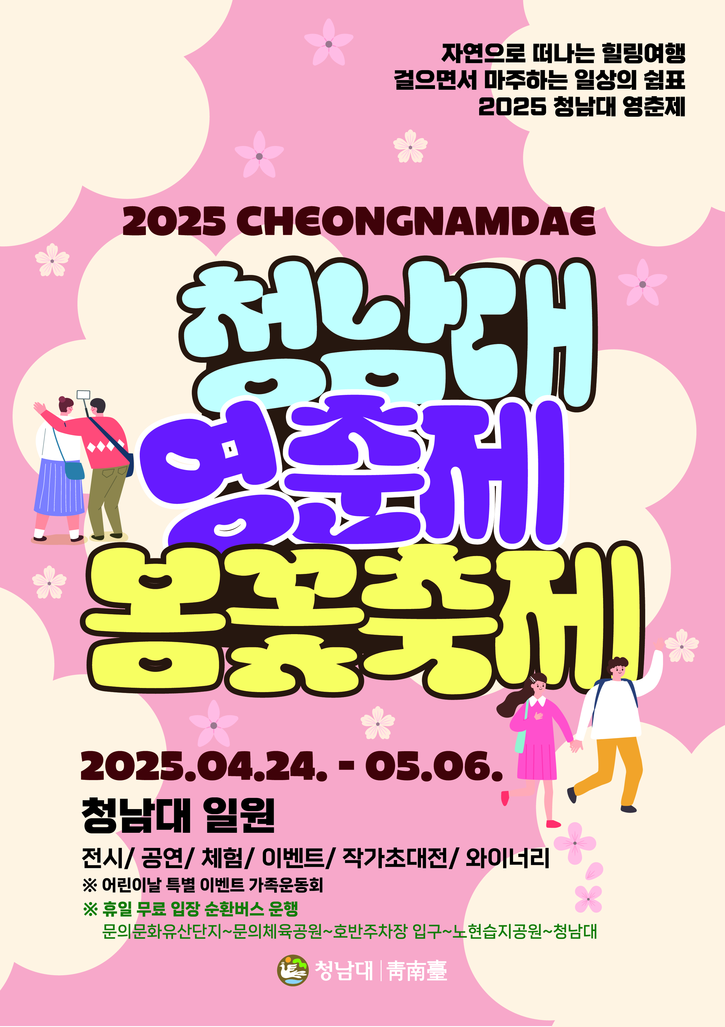 청남대 봄꽃축제 영춘제는 옛 대통령 별장 첨남대에서 다양한 봄꽃과 야생화, 분재, 목·석부작 전시뿐 아니라 문화공연, 체험, 먹거리 어린이날 가족 이벤트 등 자연과 예술, 휴식이 어우러진 충청북도 대표 봄꽃 축제입니다.